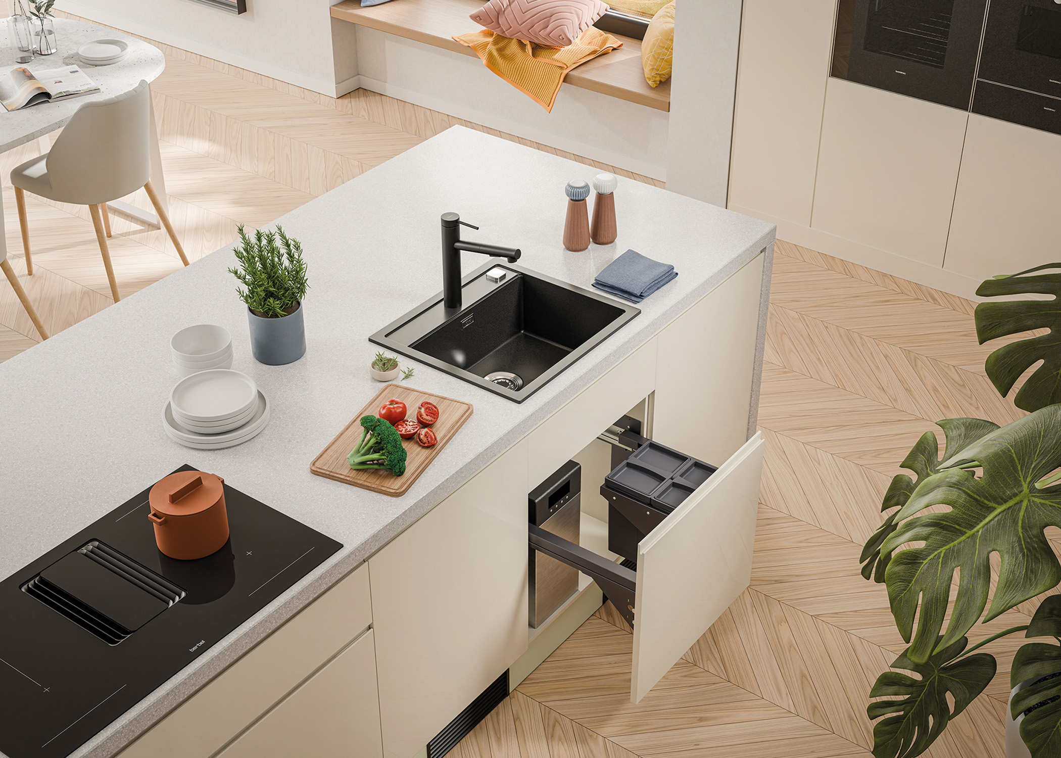 Die positiven Effekte der Rückführung von vorsortiertem Haushaltsmüll in den Wertstoffkreislauf haben die Entwicklung moderner Mülltrennungssysteme entscheidend beeinflusst. Auch wenn Platz und Stauraum für das Sammeln und Sortieren in vielen Küchenplanungen eng bemessen sind, findet sich im Naber SELECTAkit®-Programm immer eine Lösung, die sich bei einer Küchenneuplanung oder Renovierung individuell integrieren lässt. Ob Frontauszug-, Schwenktechnik oder freistehende Behälter – die innovative SELECTAkit®-Technik zeichnet sich durch hohe konstruktive Stabilität, problemlosen Einbau und ergonomische Handhabung aus.